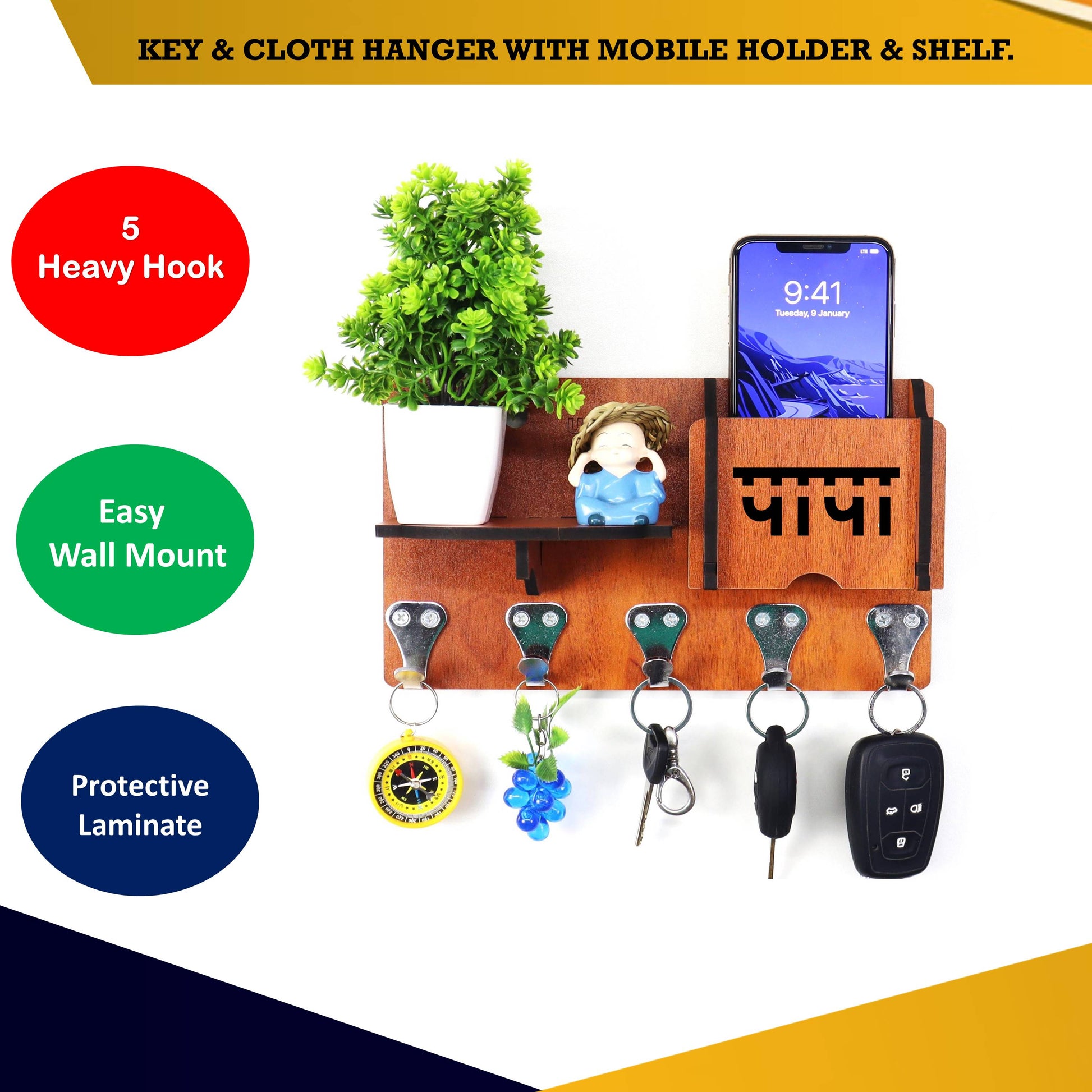 US DZIRE™ 1411 Antique Mobile Charging Stand Key Holder, Cloth Hanger Handcrafted Art For Home Decor Living Room Bedroom Wood Key Holder (5 Hooks, Brown)