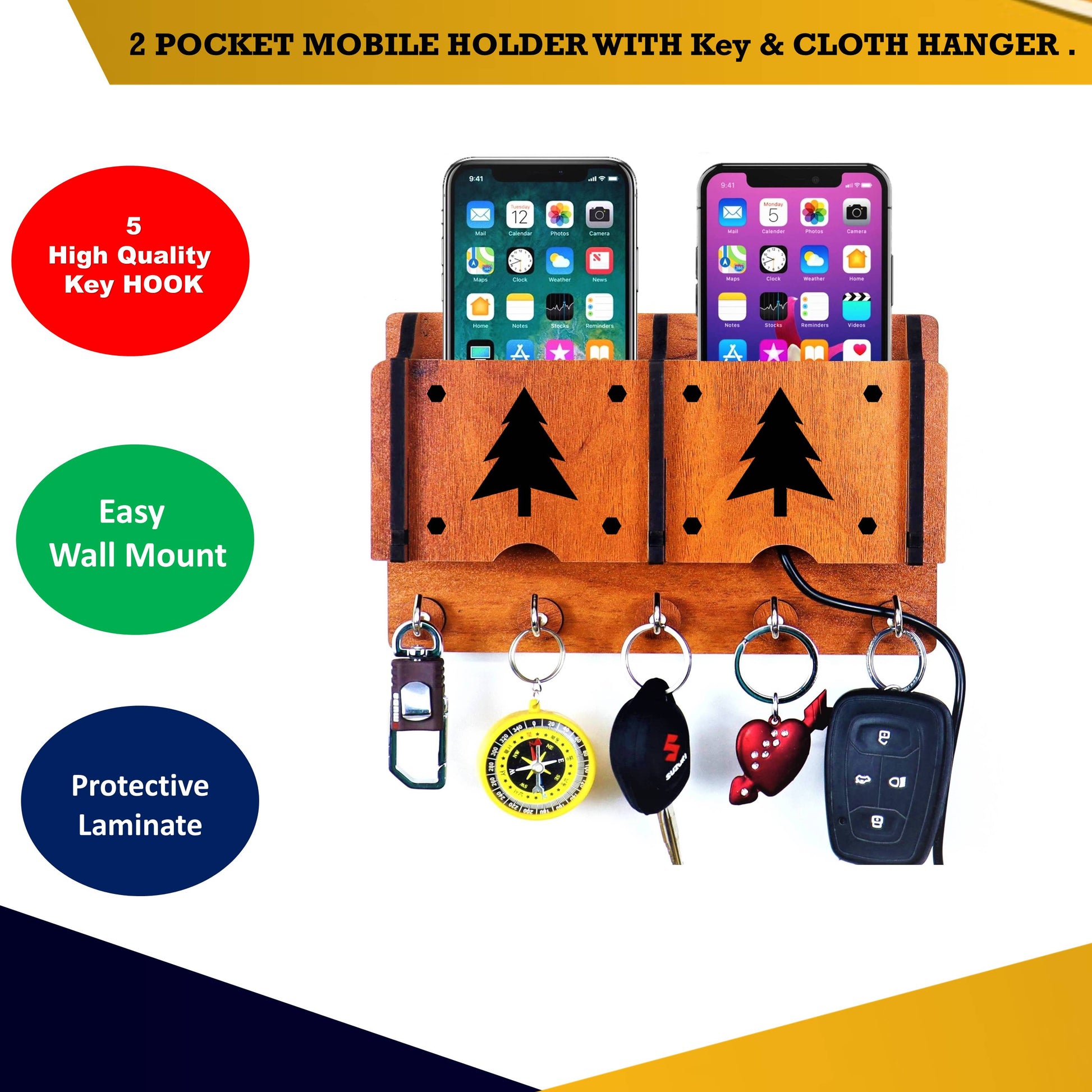 US DZIRE™ 215 Antique Mobile Charging Stand Key Holder, Cloth Hanger Handcrafted Art For Home Decor Living Room Bedroom Wood Key Holder (5 Hooks, Brown)