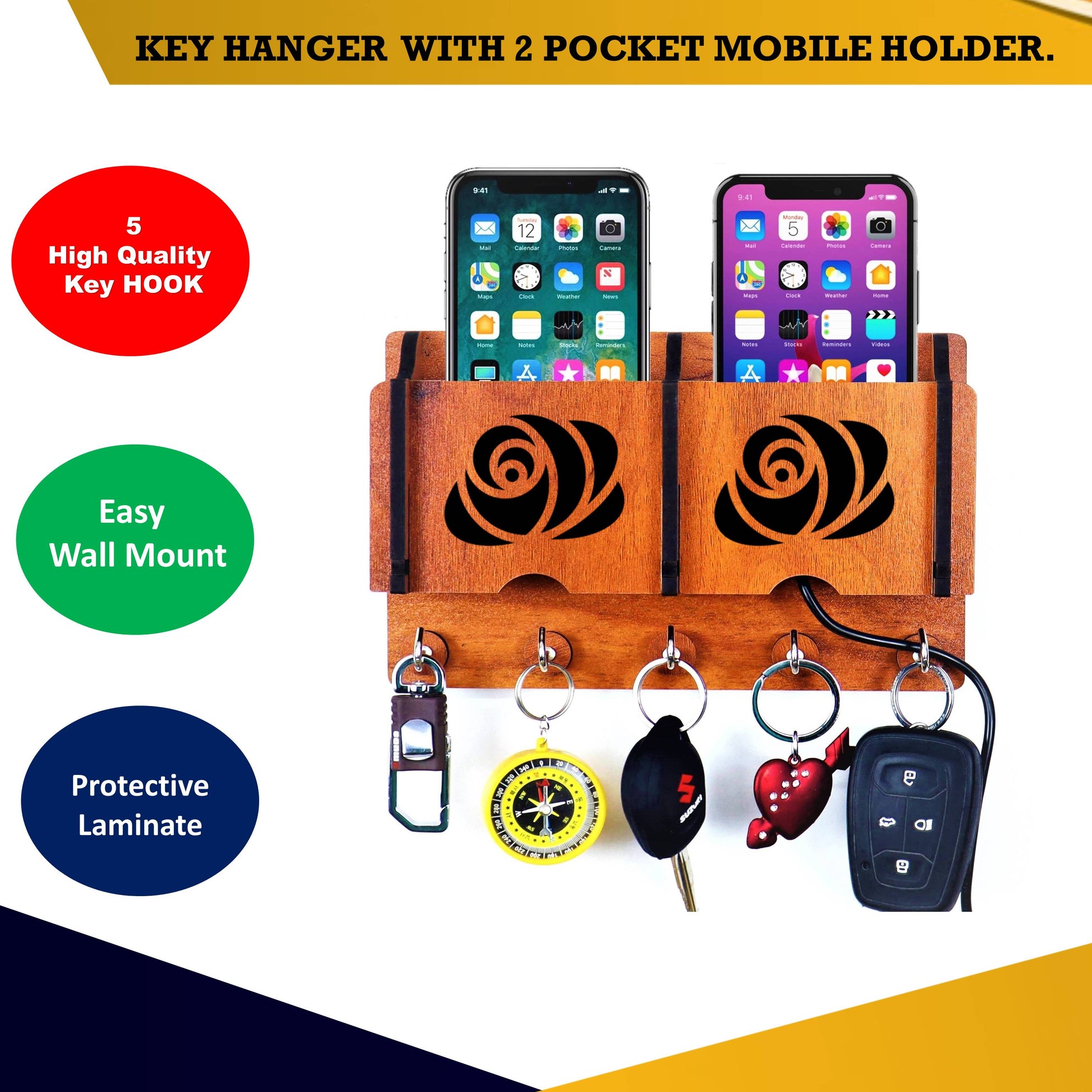 US DZIRE™ 237 Antique Mobile Charging Stand Key Holder, Cloth Hanger Handcrafted Art For Home Decor Living Room Bedroom Wood Key Holder (5 Hooks, Brown)