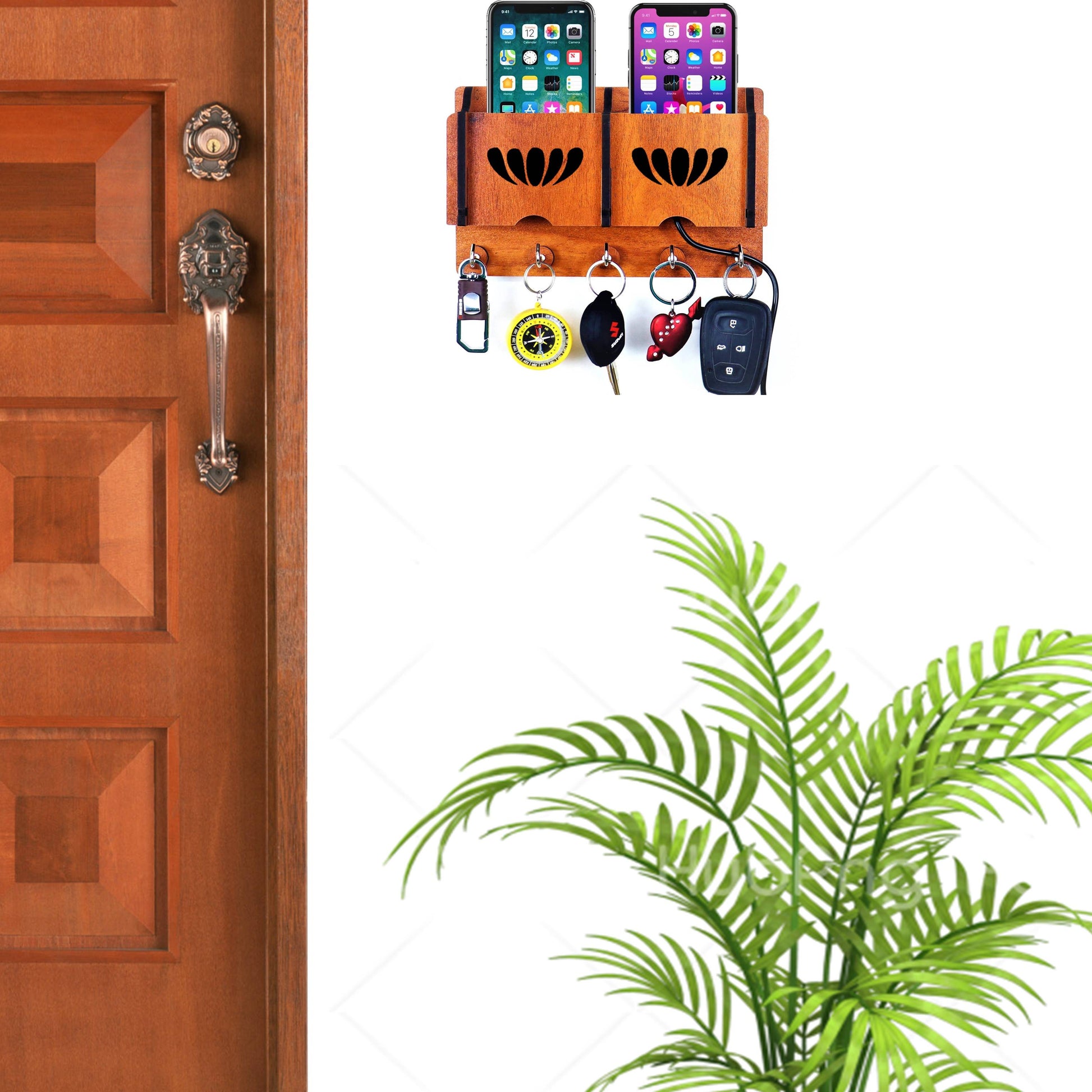 US DZIRE™ 238 Antique Mobile Charging Stand Key Holder, Cloth Hanger Handcrafted Art For Home Decor Living Room Bedroom Wood Key Holder (5 Hooks, Brown)