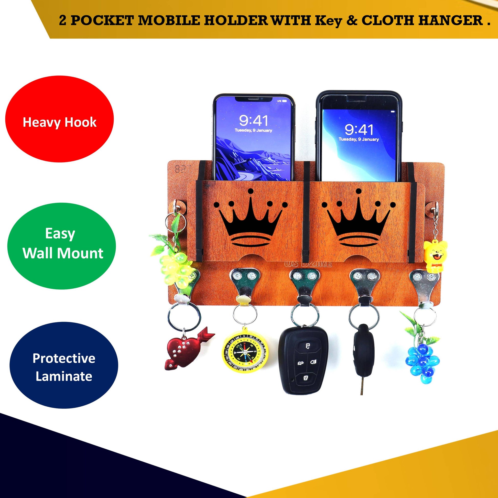 TIME MANAGEMENT: Does a messy work space make you anxious or irritated? Conveniently keep all your essential belongings organized on our gorgeous wooden Key holder! It is designed to hold many keychains. keep your space neat and clutter free. Accessories shown in the pictures are not included. STRONG STRUCTURE: The organizer is well-constructed, sturdy, durable to use for many years. Heavy duty hook weight capacity up to 10 kg. 100% QUALITY. For making these stands the master uses only the best high - quality material. The excellent handcraft has a smooth texture with a special protective laminate, which protects the product from excessive moisture or dryness and prevents all kinds of damage. SUITABLE FOR: living room, Security room, gate, kitchen, home & office anyplace. Daily reminders, all in one handy location! MOUNTING: Mounting screws & grip included in the product box.