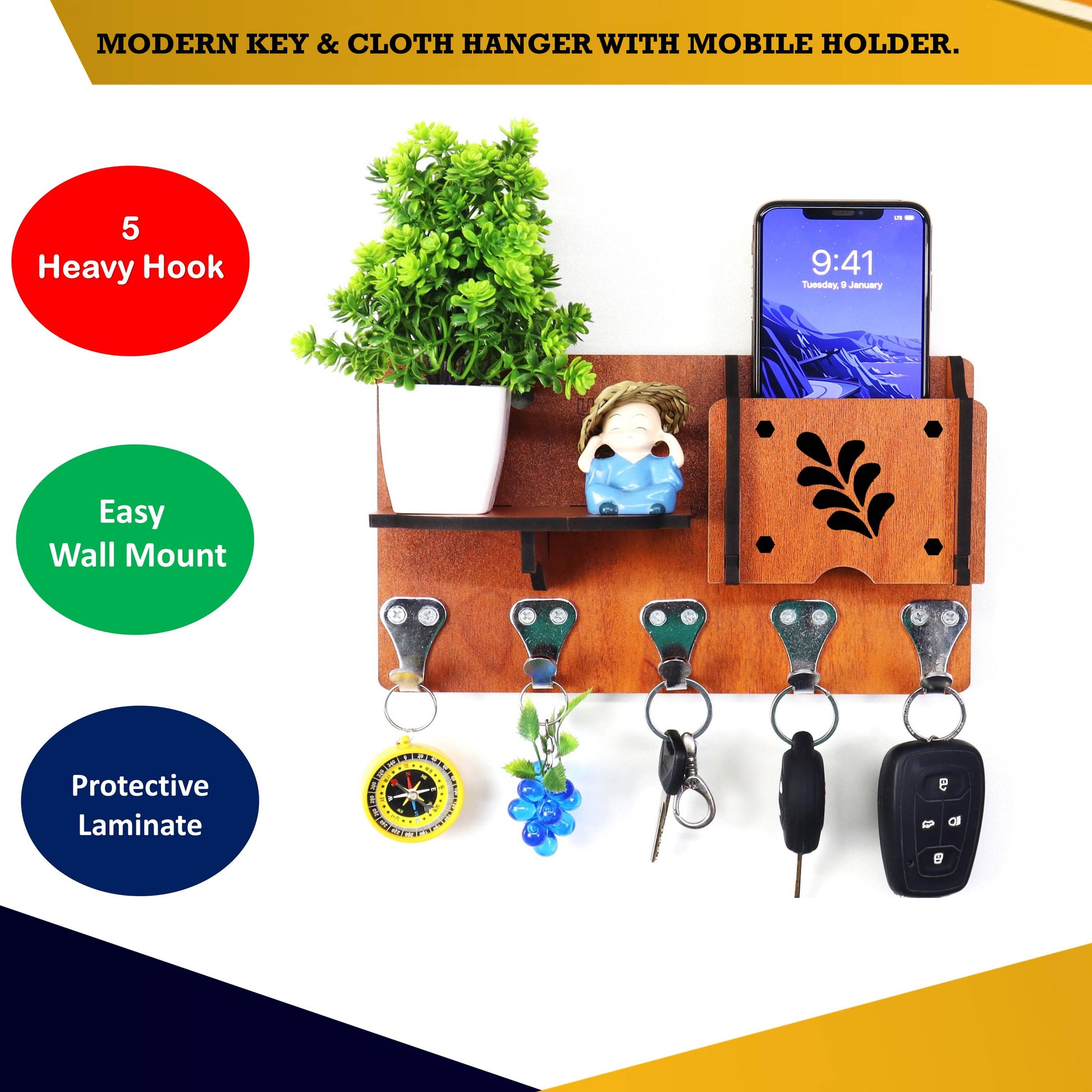 US DZIRE™ 437 Decorative Key Hanger (Brown) Wood Key Holder (5 Hooks, Brown)
