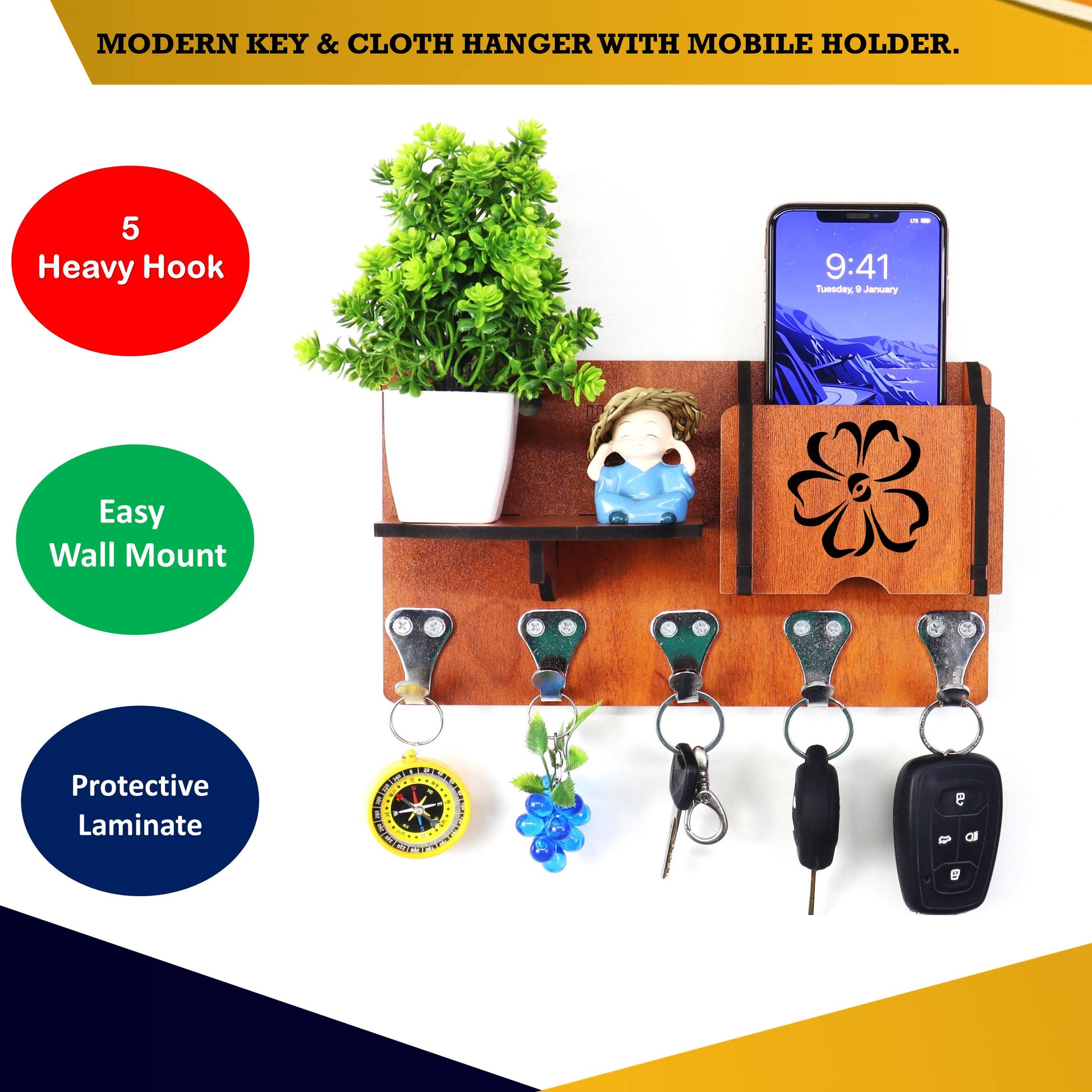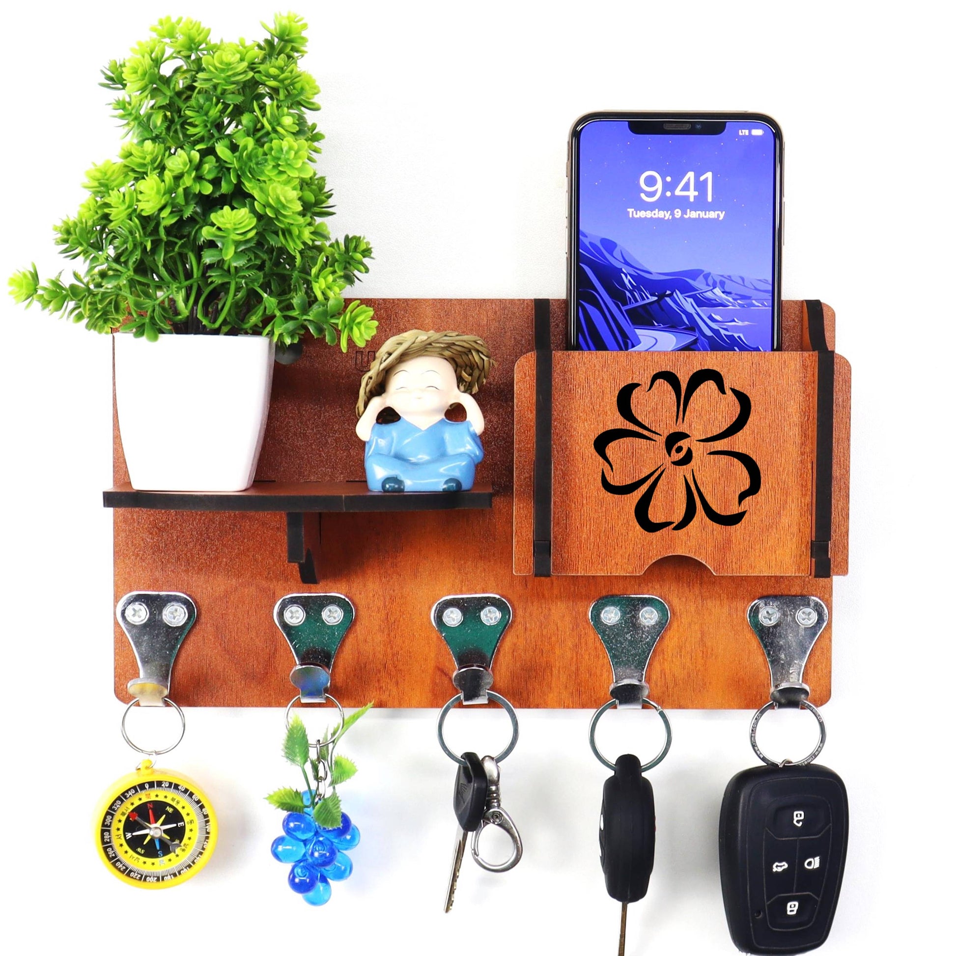 US DZIRE™ 438 Premium Key Holder For Home & Office Wood Key Holder (5 Hooks, Brown)